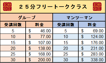 下の料金表はそれぞれ2つの区分に分かれています。左側の オレンジはグループ授業、 右側のブルーはマンツーマン授業の料金です。